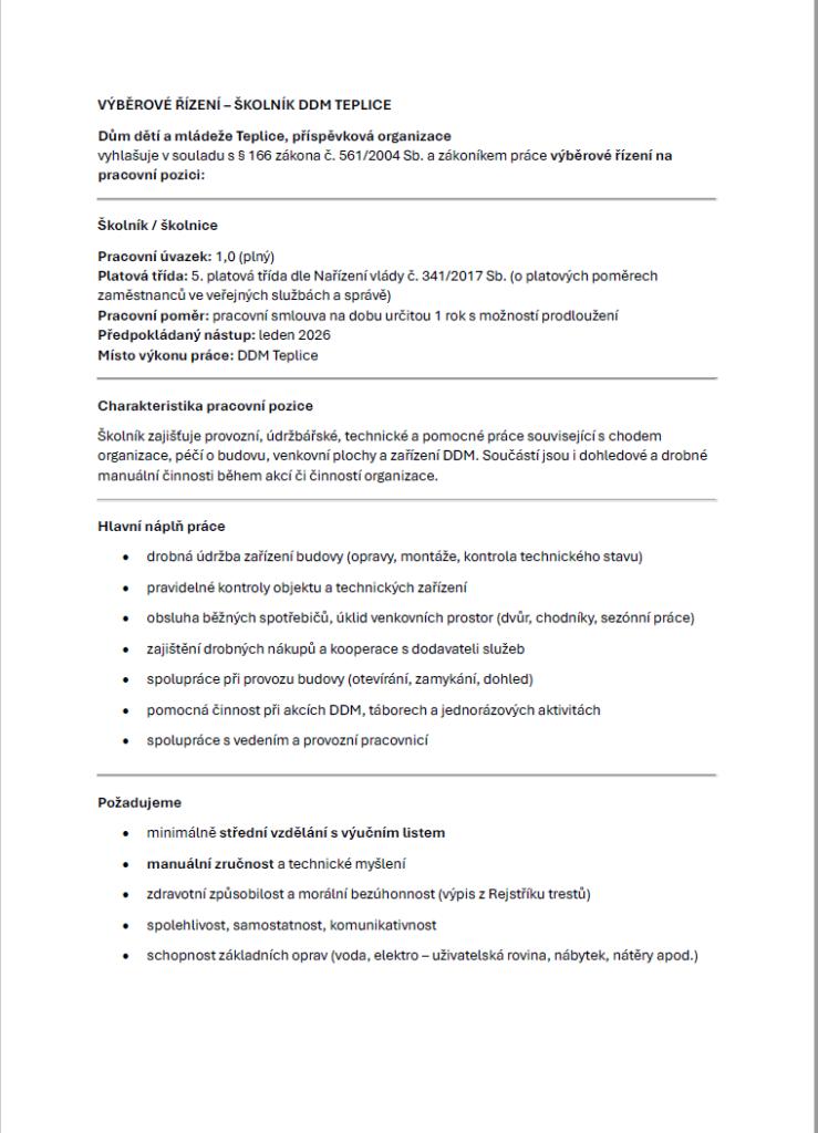 Máte šikovné ruce, smysl pro pořádek a chuť být součástí týmu, který pracuje s dětmi a mládeží?