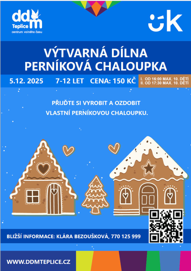 Přijďte si s námi užít tvořivé odpoledne a odneste si domů krásnou perníkovou chaloupku, která provoní váš domov vánoční atmosférou! V naši speciální výtvarné dílně si budete moci z upečených perníkových dílů sestavit a cukrové polevy ozdobit svou vlastní perníkovou chaloupku.